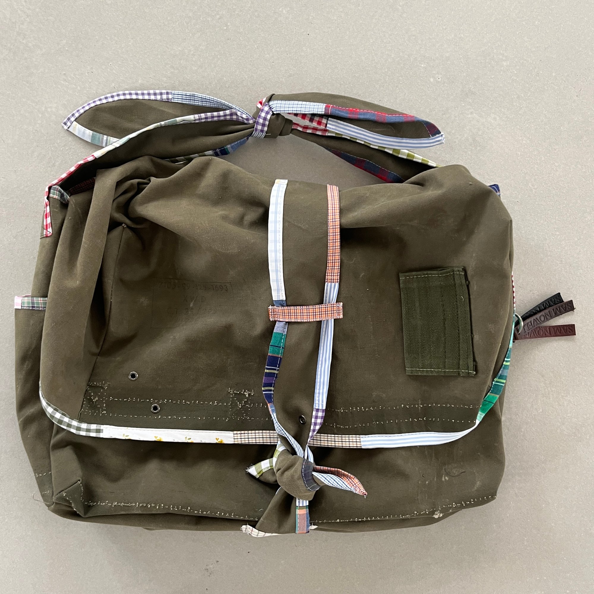 SAM NOWELL 'DEPOT' sling bag. Surplus military canvas shoulder bag with Oxford shirt binding throughout. 1/6.