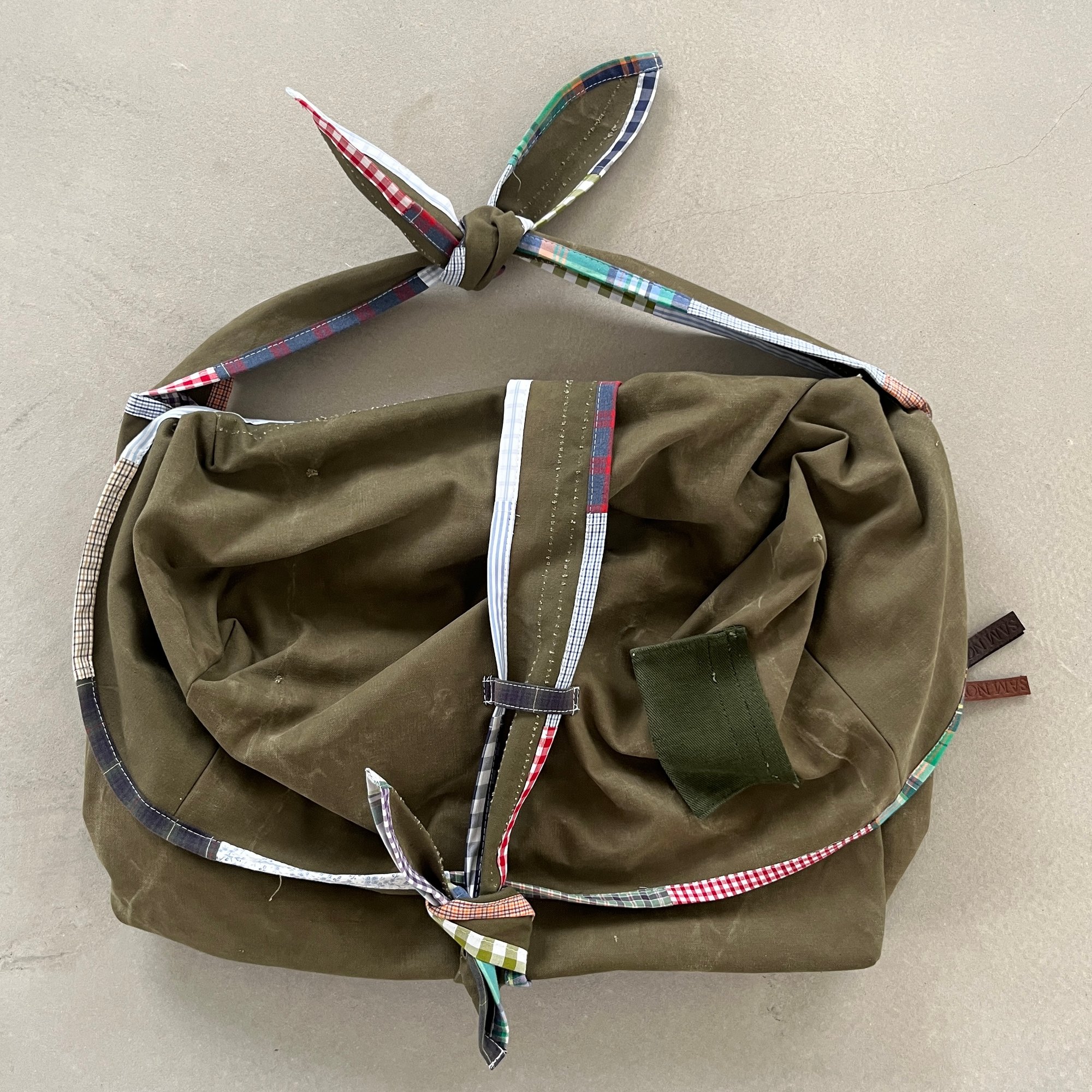 SAM NOWELL 'DEPOT' sling bag. Surplus military canvas shoulder bag with Oxford shirt binding throughout. 1/6.